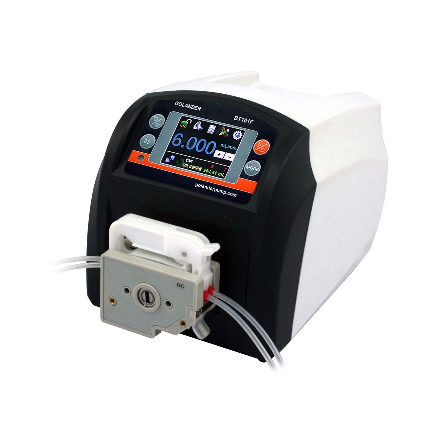 BT101F intelligent dispensing peristaltic pump provides flow range from 0.00011 to 720 mL/min with variable pump heads and tubings. It's easy to operate with intuitive and clear interface with color LCD touch screen. There are four operation modes available: Volume Dispense Mode, Time Dispense Mode, Copy Dispense Mode and Flow Mode. The system minimizes working noise due to the intelligent cooling fan control. With RS485 MODBUS interface, the pump is easy to communicate with external device, such as PC, HMI or PLC.